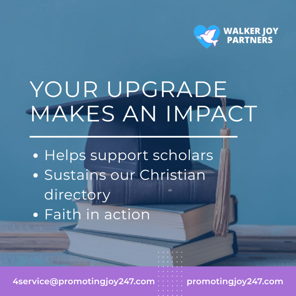 Thank you for joining the Walker Joy Partners/promotingjoy247.com Christian online directory as a FREE partner subscriber. We appreciate your support and partnership in our mission to connect consumers with Christian ministries and businesses.